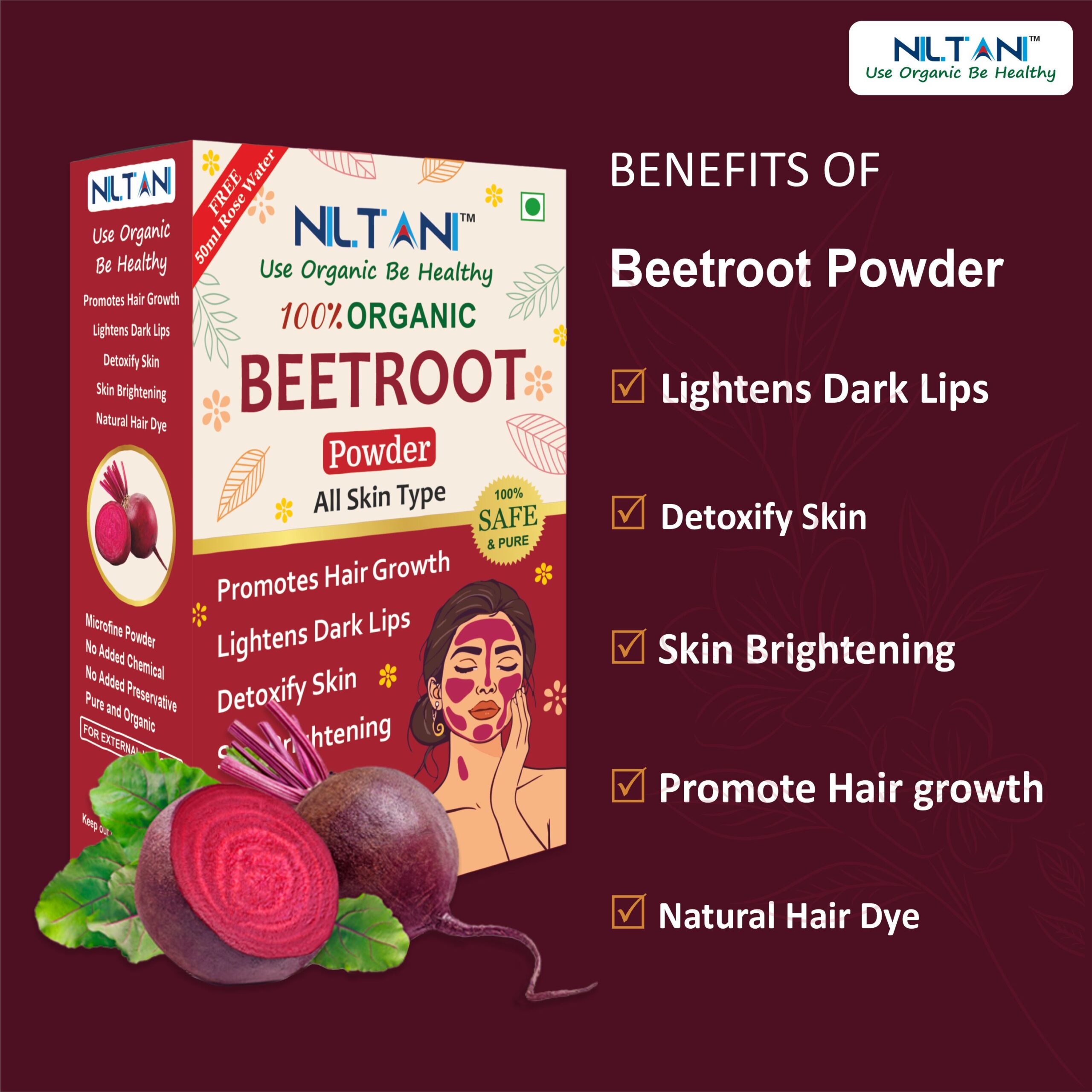 - Niltani bChemical-free and cruelty-free formulation ensures a safe, gentle experience suitable for all skin and hair types, including sensitive skin.eetroot powder rich in Vitamin C & iron
